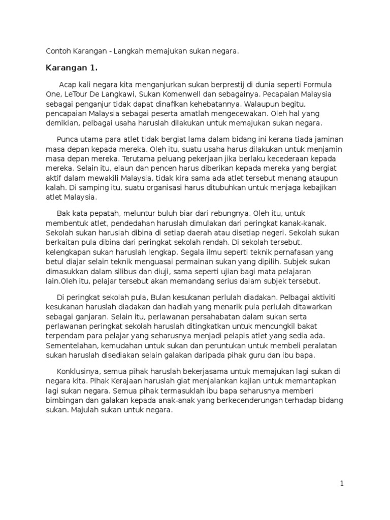 Contoh Karangan Sukan Kerajaan telah memperkenalkan dasar 1Murid 1Sukan. Mereka lebih gemar menceburi aktiviti yang lasak dan mencabar. Sayang seribu kali sayang golongan muda sering.